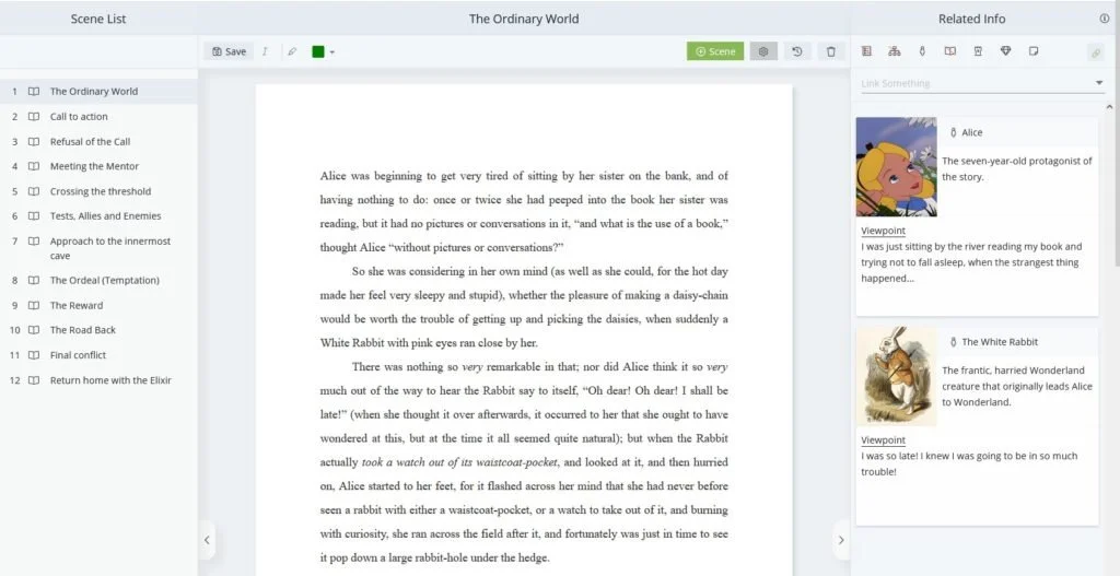 The Novel Factory offers a structured approach to novel writing, with built-in guidance on character development, world-building, and plotting. It’s a fantastic tool for writers who prefer a step-by-step method, but I found it too rigid for my personal writing style. I like having more flexibility in how I develop my stories, so while The Novel Factory has great features, it didn’t quite fit my needs.