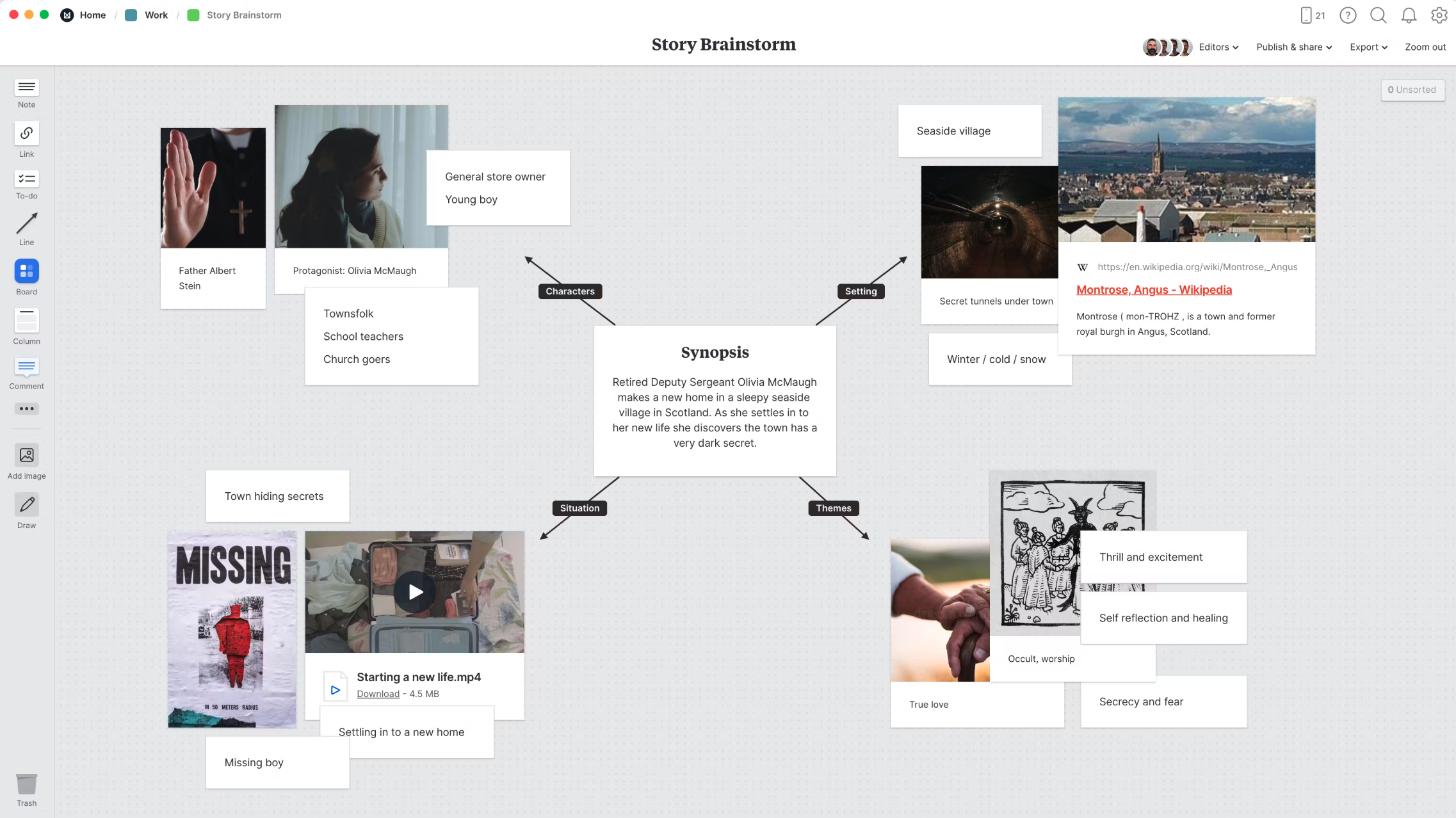 I use Milanote to a lesser degree, but it’s great for visual organization, especially when brainstorming and mood boarding. It’s particularly useful for mapping out character relationships, setting aesthetics, and pinning visual inspiration. I don’t rely on it daily, but when I’m in the early stages of a project and need to visualize elements of my story, Milanote is a great supplement to my other tools.